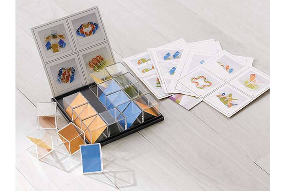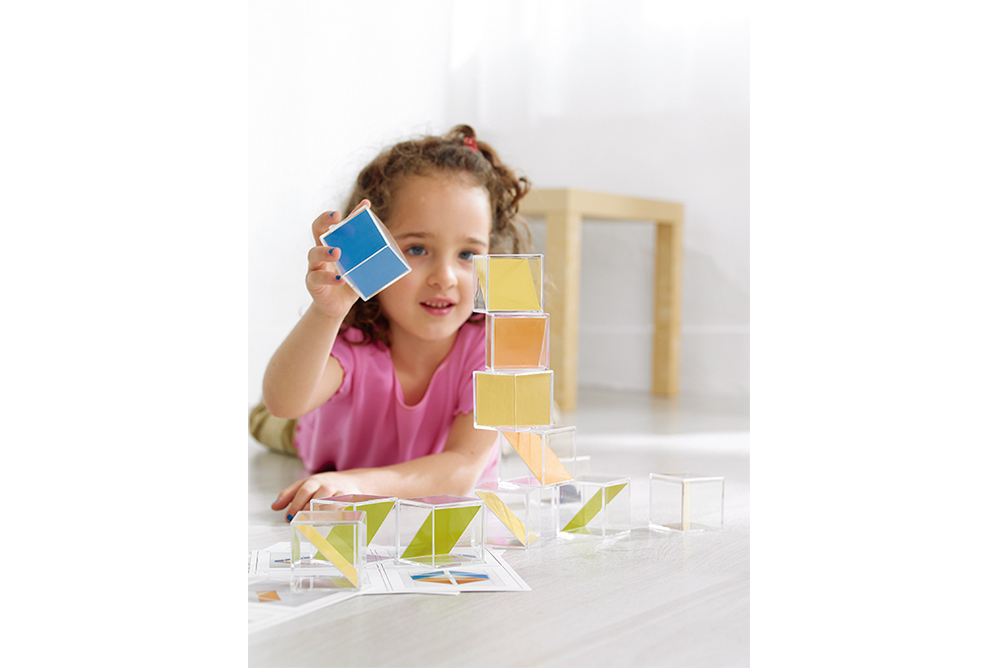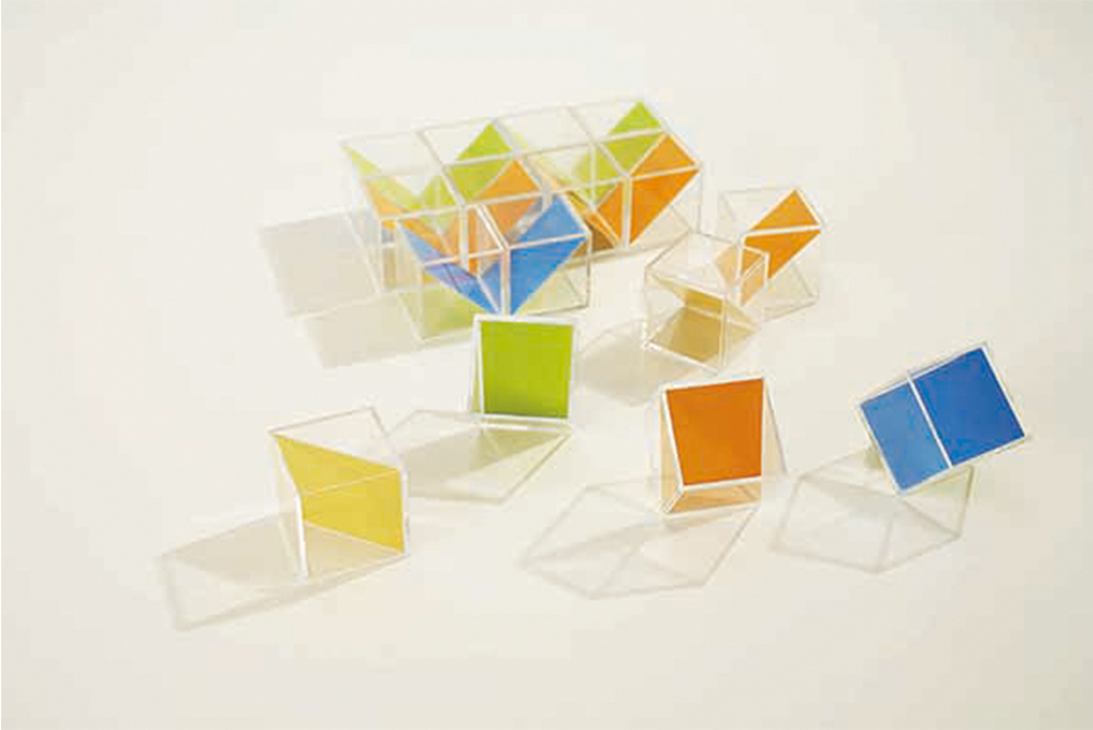 透明積木中放入斜面色卡,讓積木堆疊出虛和實的對應,四種色彩與透視感交織成無限空間的趣味遊戲。