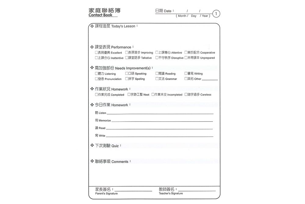 每頁規劃課程進度、課堂表現、需加強部份、作業狀況、今日作業、下次測驗等,紀錄孩子在校所有的學習狀況與課程進度,頁尾設置「聯絡事項」,老師可將學生的學習進展及其優缺點告知家長,家長便能幫助孩子克服可能遭遇的困難,達到有效的雙向溝通。
