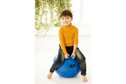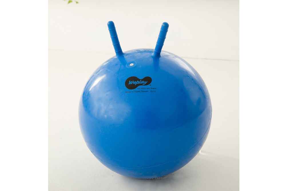 1. 讓孩子坐在球上,握緊把手,雙腿夾住球體上下或前後跳躍,彈力十足,有趣又好玩。
