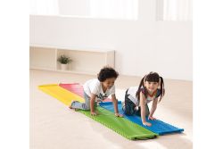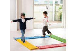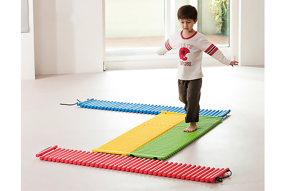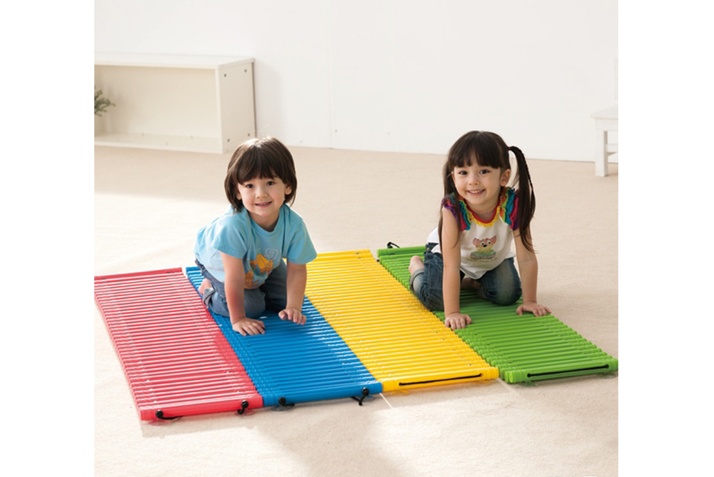 由塑膠橫桿組成的步道,每組4串4種顏色,可相互串連,讓幼兒在上面儘情爬、走、跑、跳,