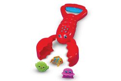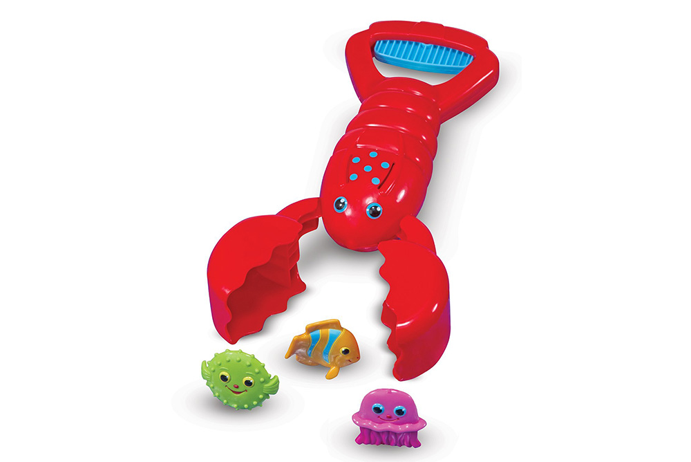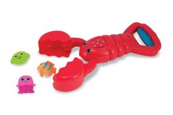 按壓藍色蝦尾,龍蝦鼇就可以夾起小魚,更適合放在大水池中玩,或是利用龍蝦抓取生活中的小物品,