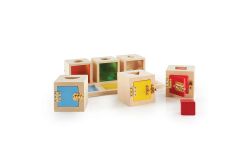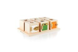 彩色門的木箱,每個都有不同造型的鎖扣、幾何天窗與彩色觀察窗,啟發孩子探索樂趣、培養顏色形狀配對與精細動作。