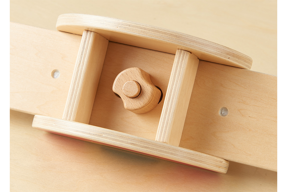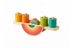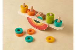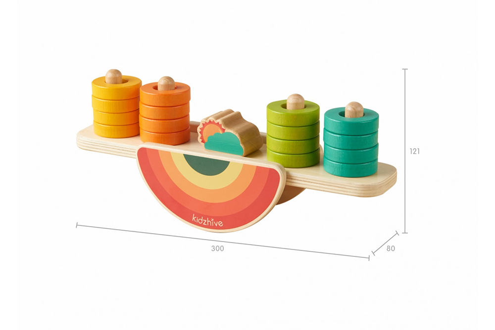 透過簡單圖形與豐富色彩,增進親子互動,左右兩邊套環套上圓形砝碼(木環),讓孩子認識數量與重量間的關係。