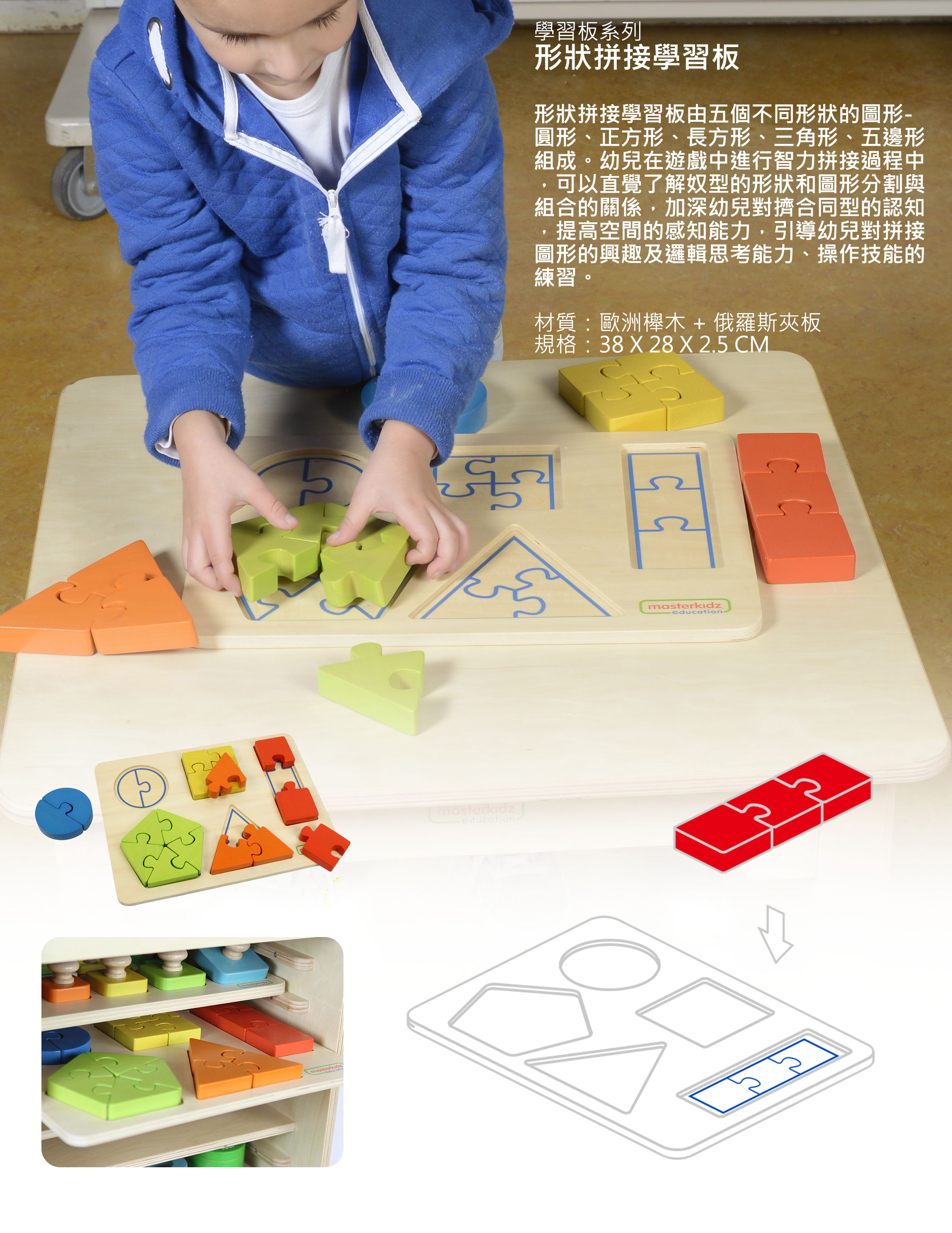 1. 五種基礎的幾何圖形(包含圓形、三角形、正方形、長方形及五角形),從操作過程中學習圖形的分割組合。
