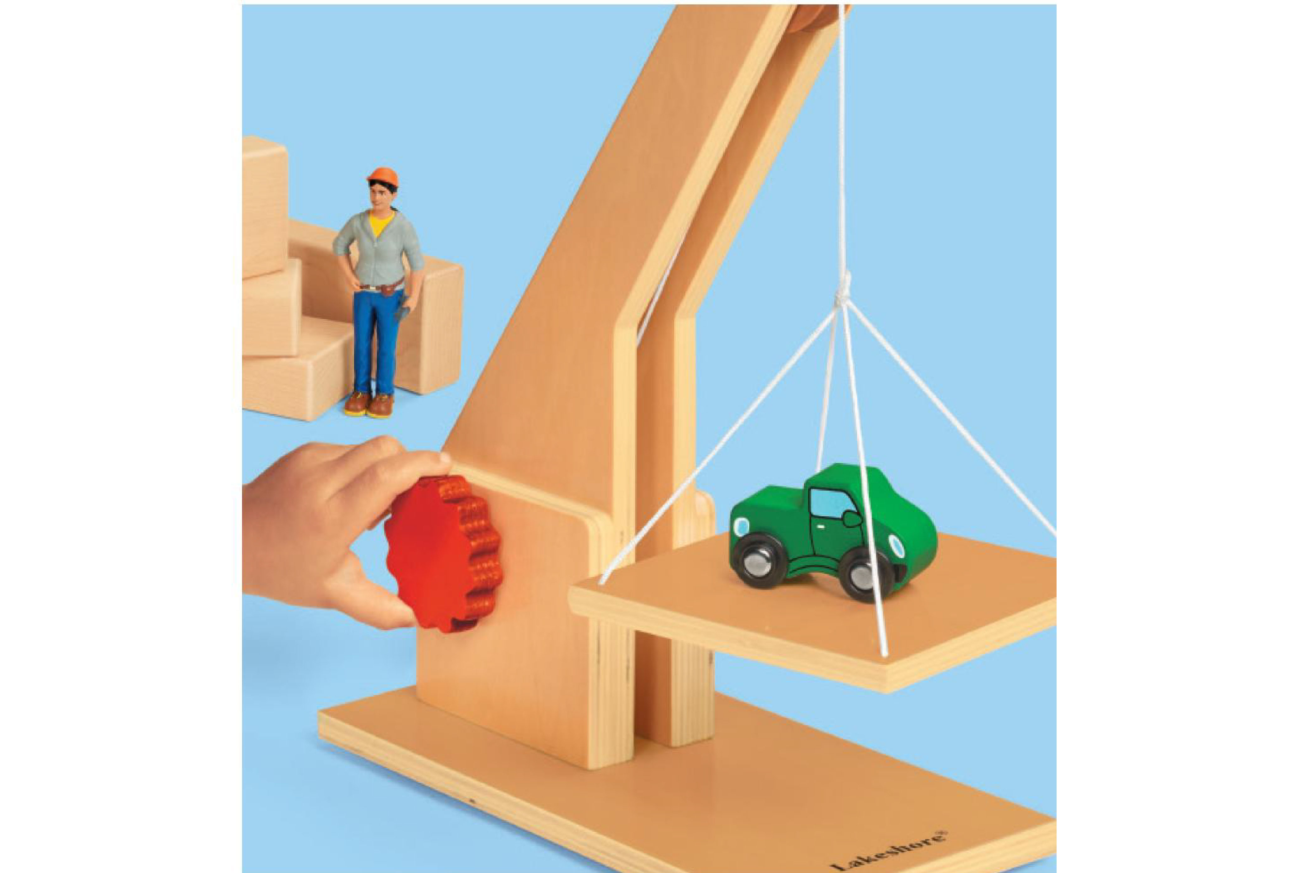 轉動旋鈕以啟動滑輪系統並將平台上下移動,使起重機給孩子們帶來實際的效果,