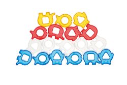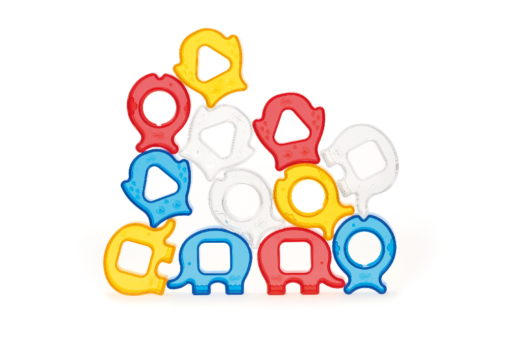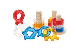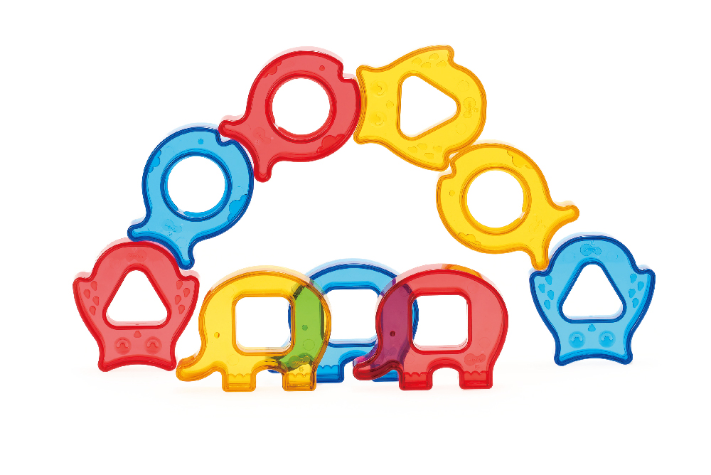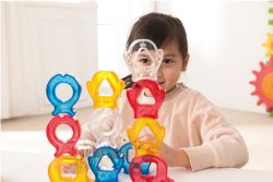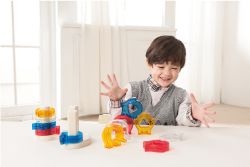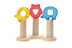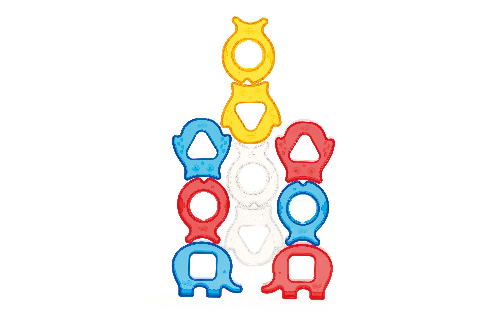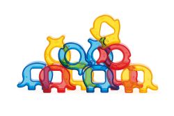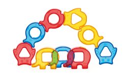 肚子形狀不同的三種可愛動物積木和彎月形底座,提供套環及螺絲旋轉的遊戲;獨特的透明材質,
