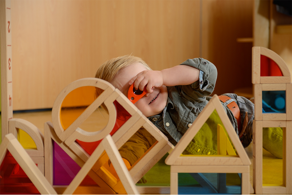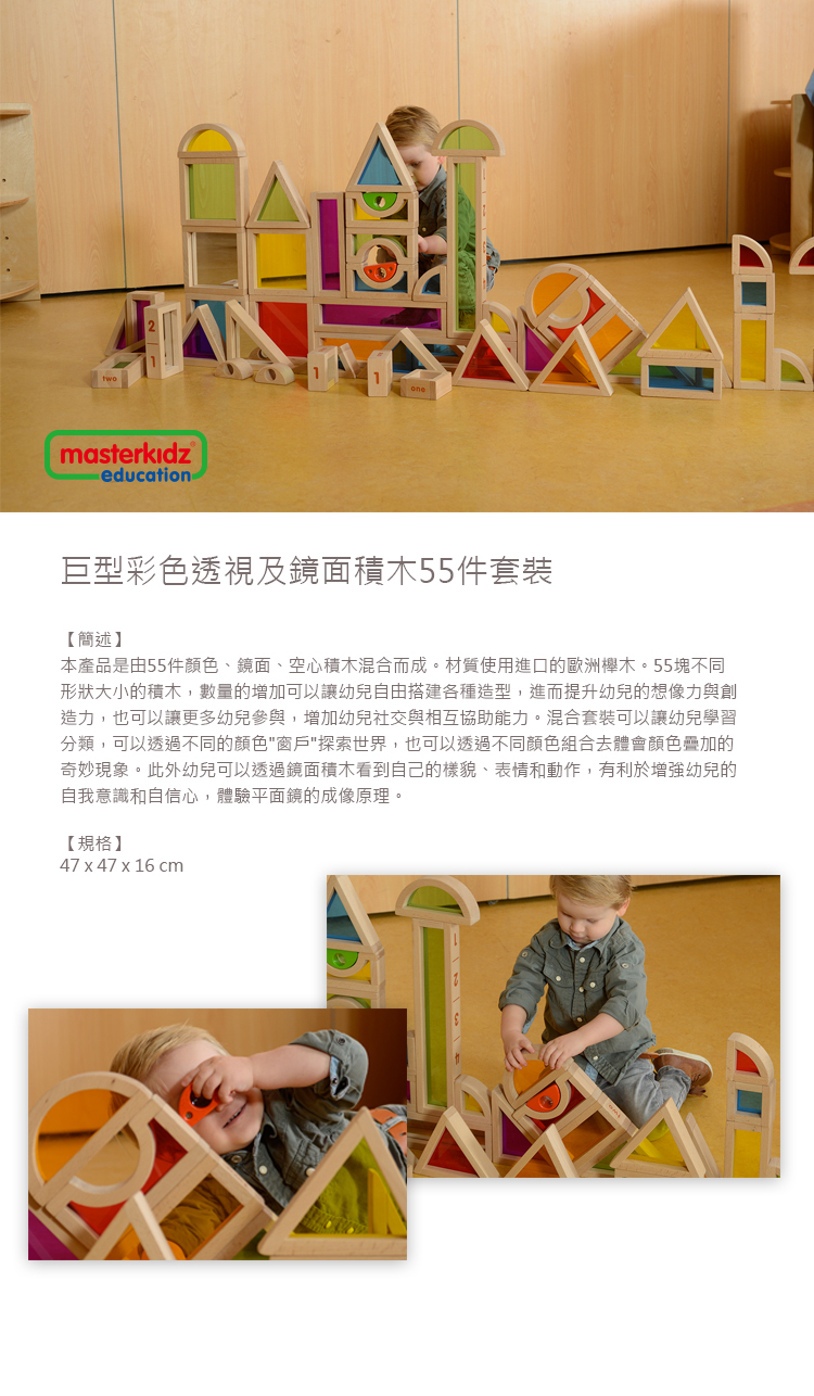顏色疊加的奇妙現象。此外,幼兒可以透過鏡面積木看到自己的樣貌,表情和動作,