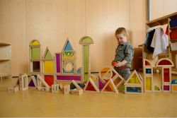 本產品是由55件顏色、鏡面、空心積木混合而成,材質使用進口的歐洲櫸木,55塊不同形狀大小的積木,