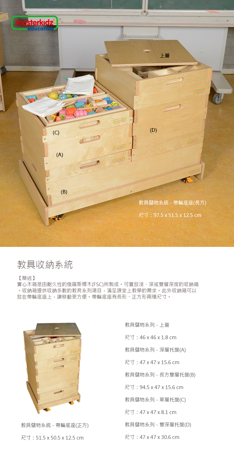 教具收納盤系列可置放正方形、長方形托盤,每種托盤又包括了不同深度。