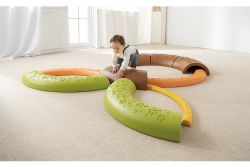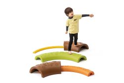 由寬到窄、高低不同的腳印平衡木,相互嵌合就能變出圓形、波浪及各種創意路徑,挑戰孩子跨越或行走的平衡能力,