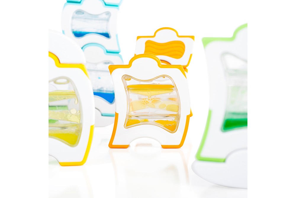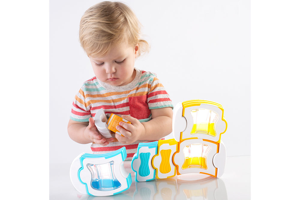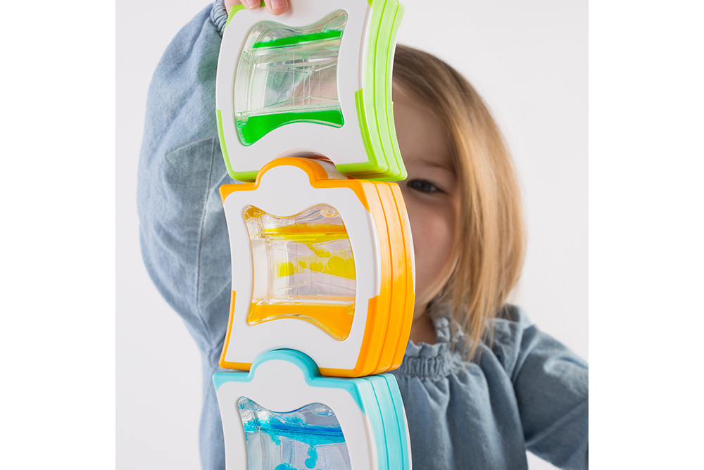 4. 厚實的積木設計,適合幼兒小手,翻轉積木時觀察彩色液體的流動。