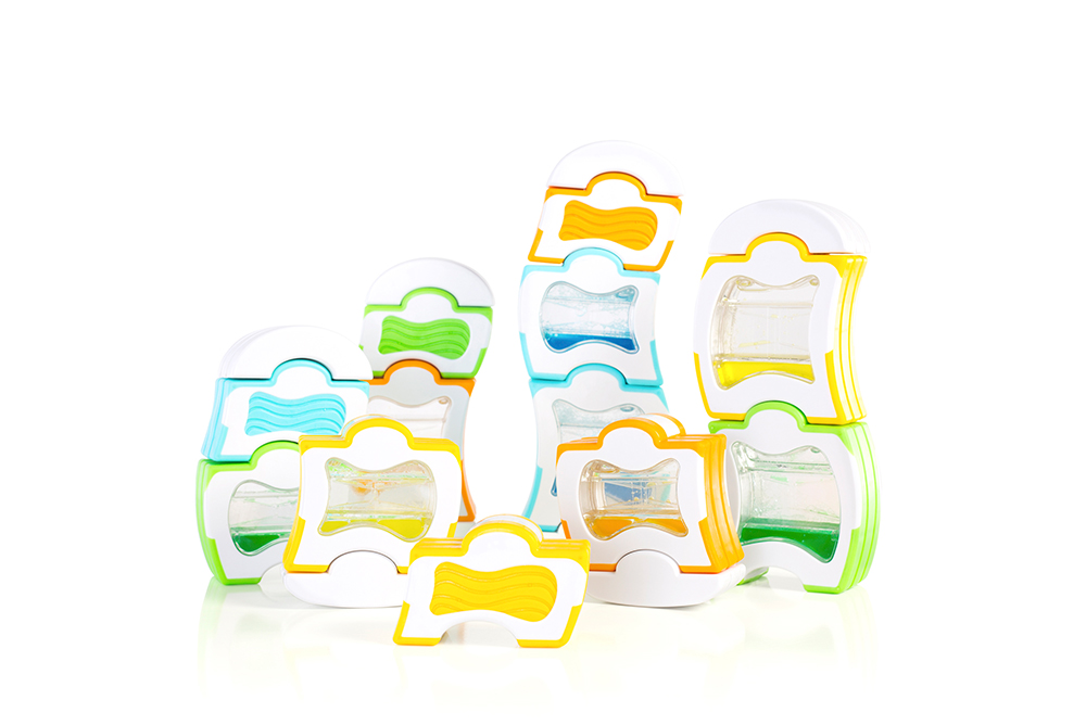 波浪造型的磁力積木,包含實心的觸覺積木和水滴漏積木,在建構中提供豐富的觸覺與視覺感官經驗。