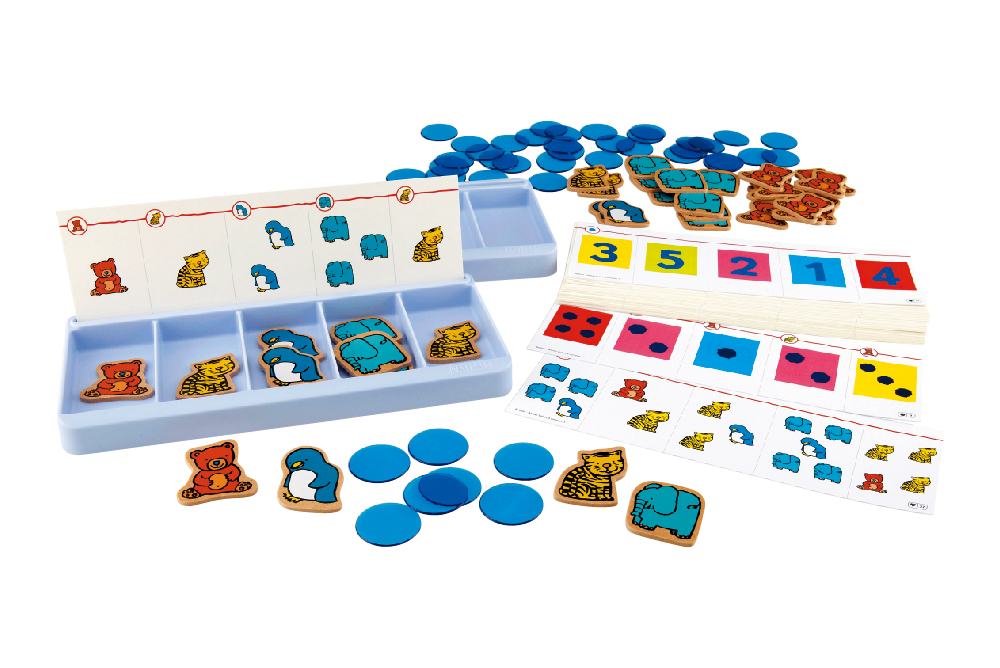 1. 透過遊戲圖卡與動物計數片與圓形計數片,建立孩子數量與數字的基本概念。