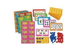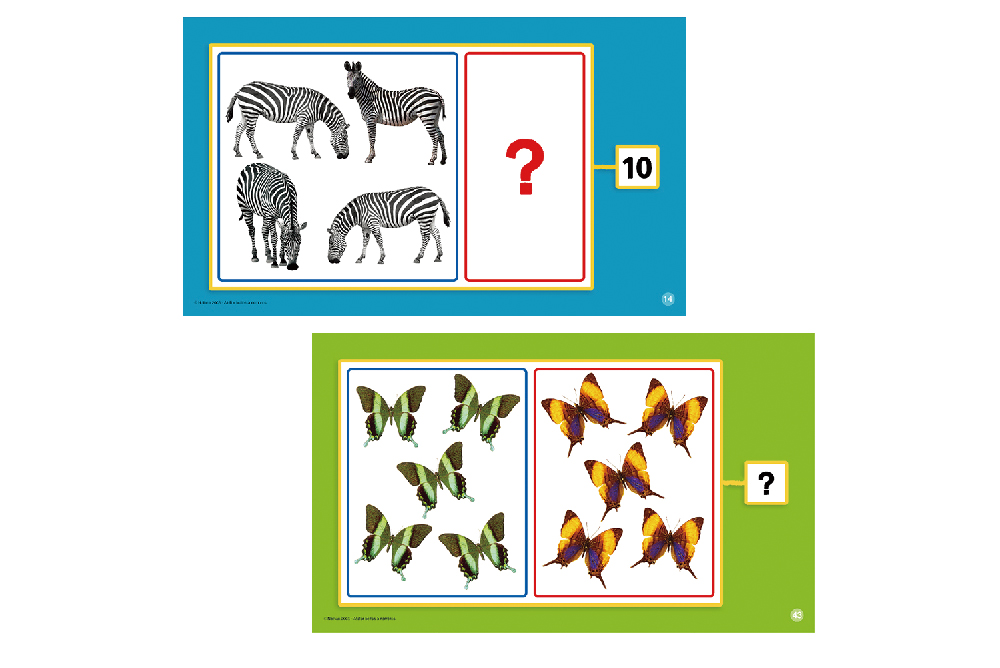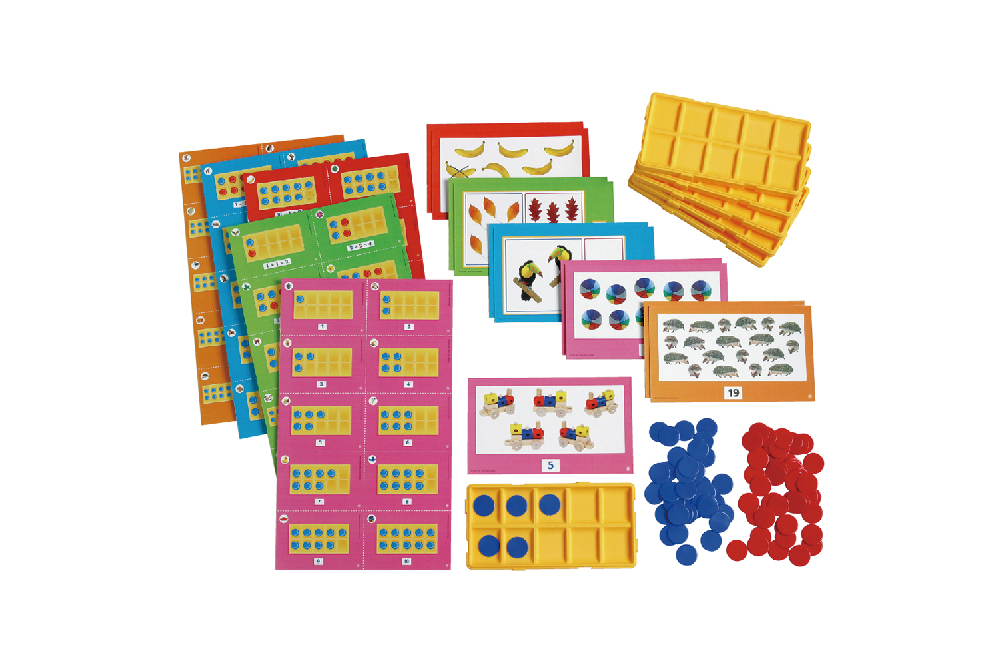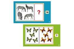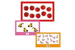 計數片、操作盒搭配五種主題之題目卡,從簡易的數量對應到20以內的加減遊戲,