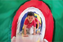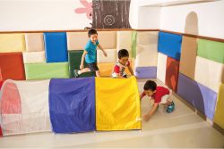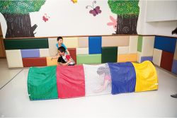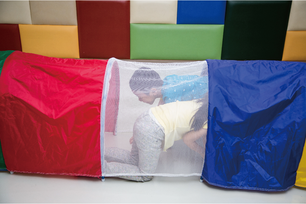 有如山洞,能於其中爬行穿梭,透過不同空間與高度,讓身體感受在山洞裡行進的姿態,借以獲取有趣的經驗。