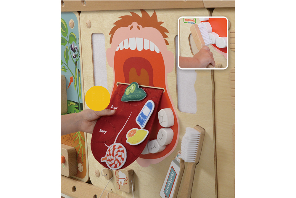 有趣的口腔健康學習板配有牙刷,牙縫清潔線和牙膏,幼兒可從中學習刷牙,清潔牙縫等自本生活自理技巧。
