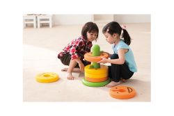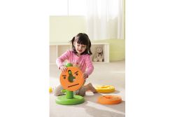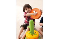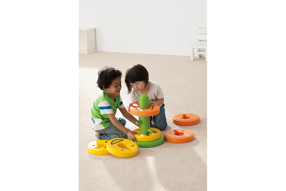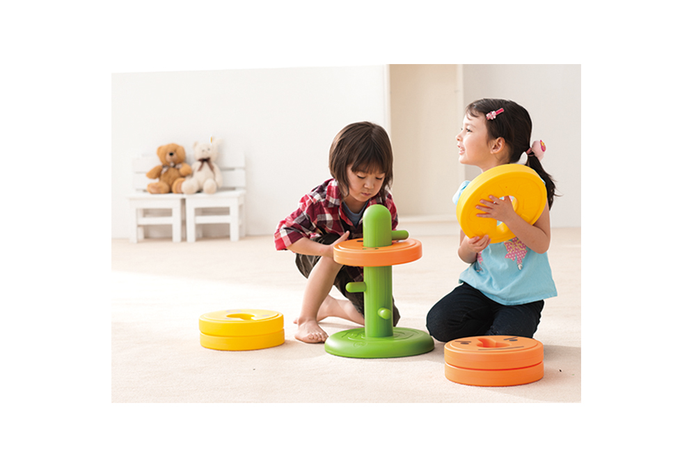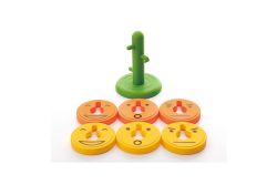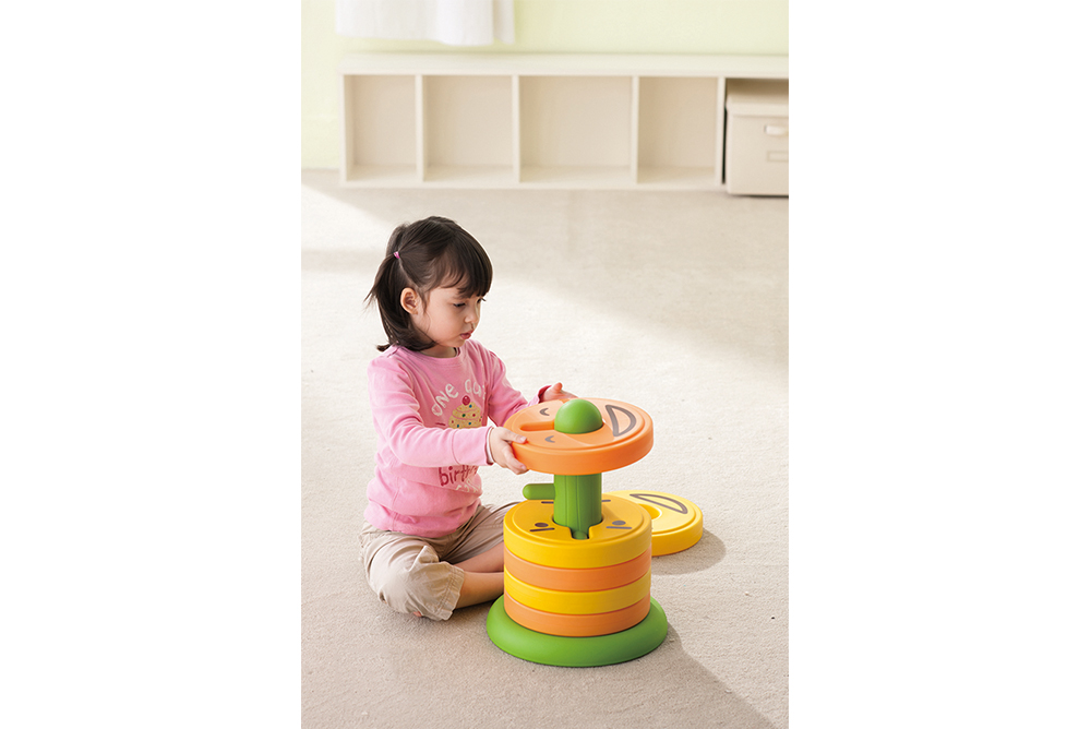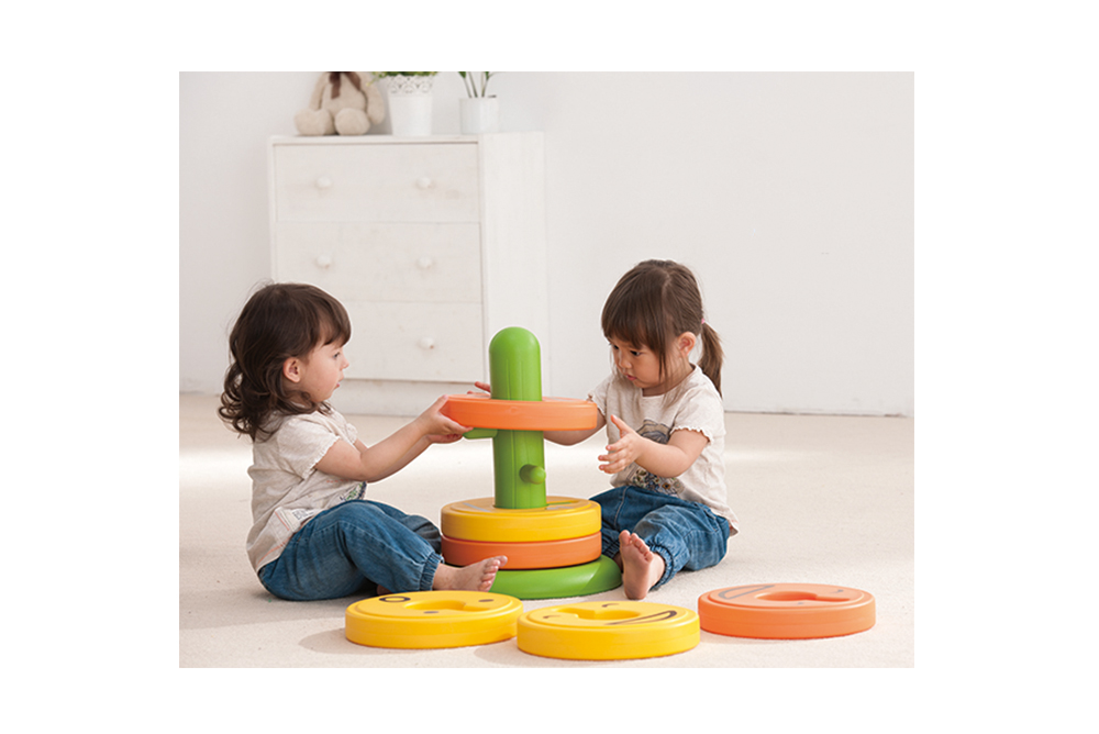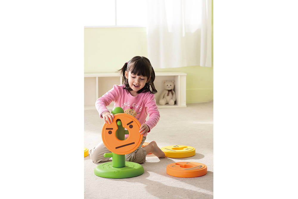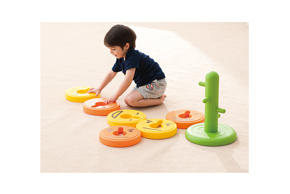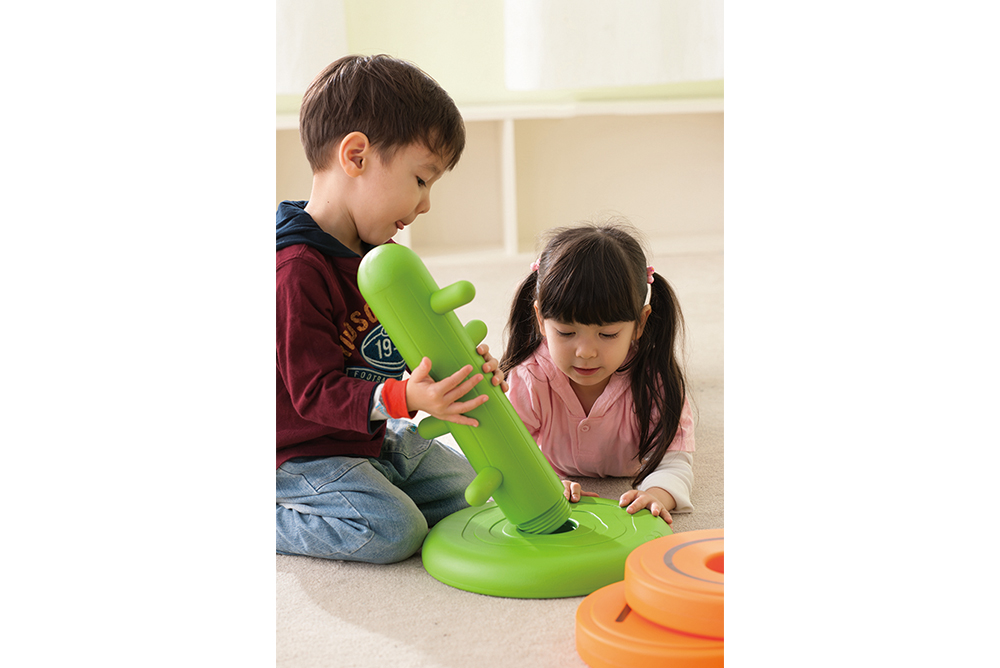 幼兒將表情圓盤套入仙人掌主幹時,需配合細枝幹的位置調整圓盤方向才能完成,孩子可以用坐姿、跪姿或站姿進行遊戲,無形中增進了肢體運動機會,並需思考如何讓圓盤成功套入或取出,也提昇了解決問題的能力及專注力。