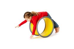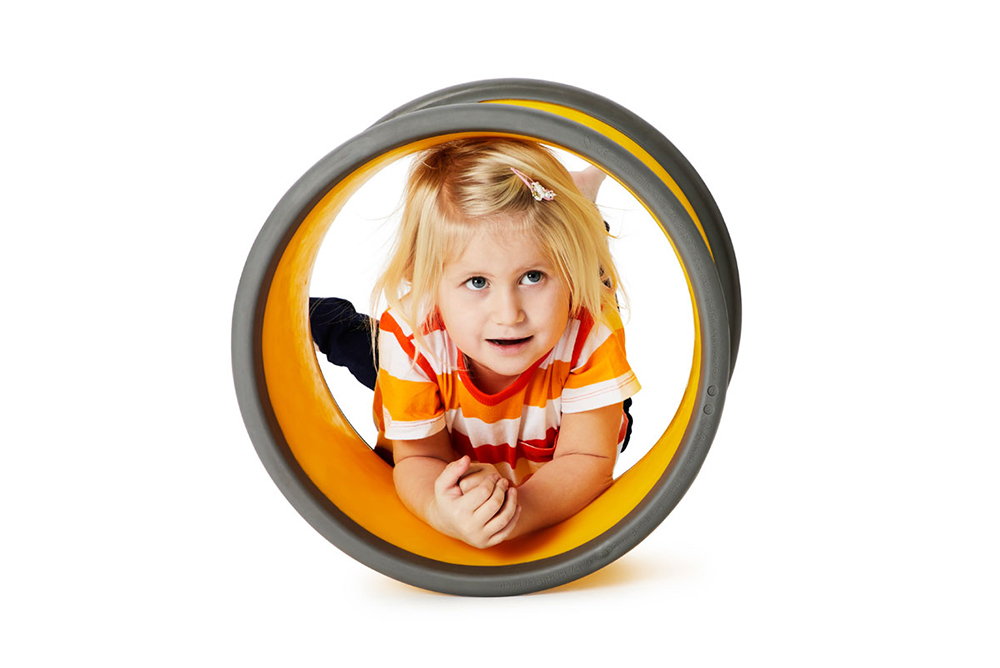 多元滾輪組可進行各種堆疊,創意玩耍,中間有一個大孔,幼兒在裡面可進行仰臥,俯臥玩耍,攀爬,