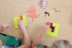 圍欄搭建在綠色草地上,鋪上黃色的泥土,根據圖案來放入對應的動物,計算面積的數量。