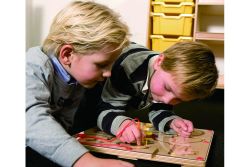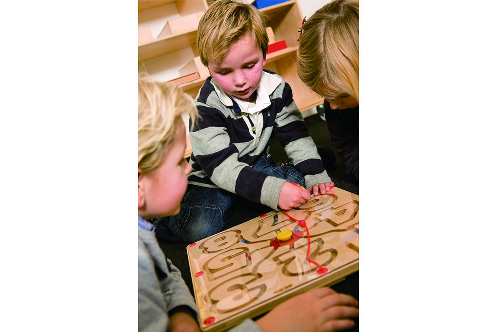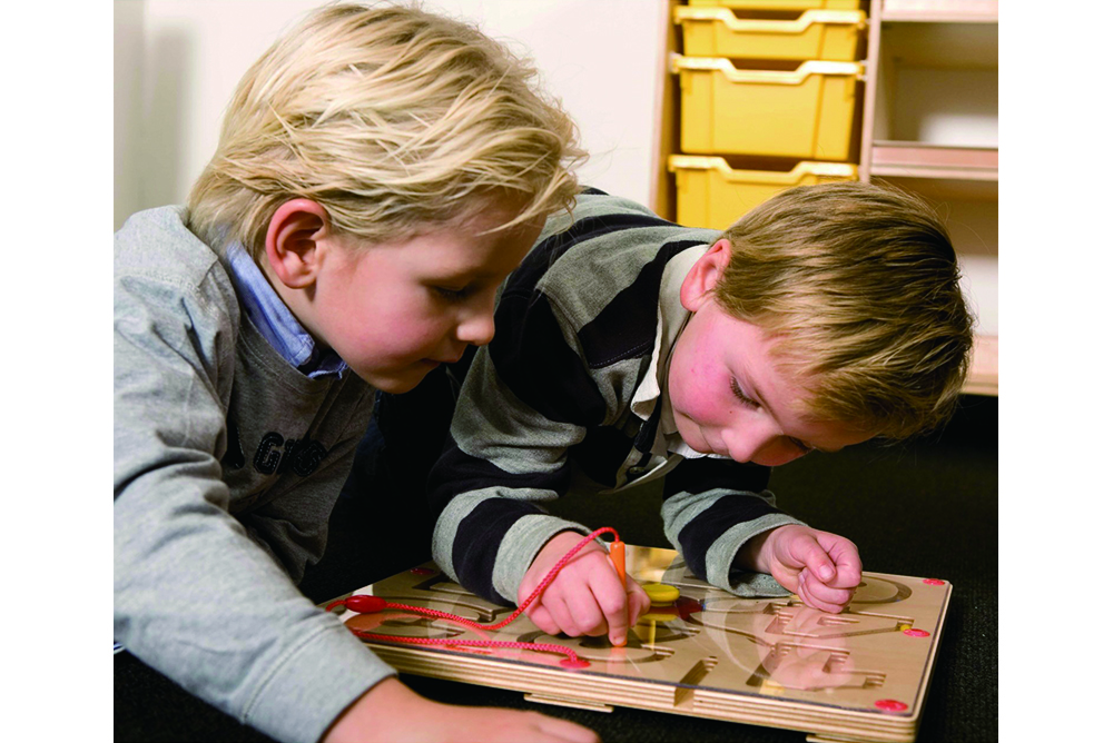 根據這些卡片,孩子們用磁鐵筆把有顏色的珠子從迷宮挪到正確的出口點。