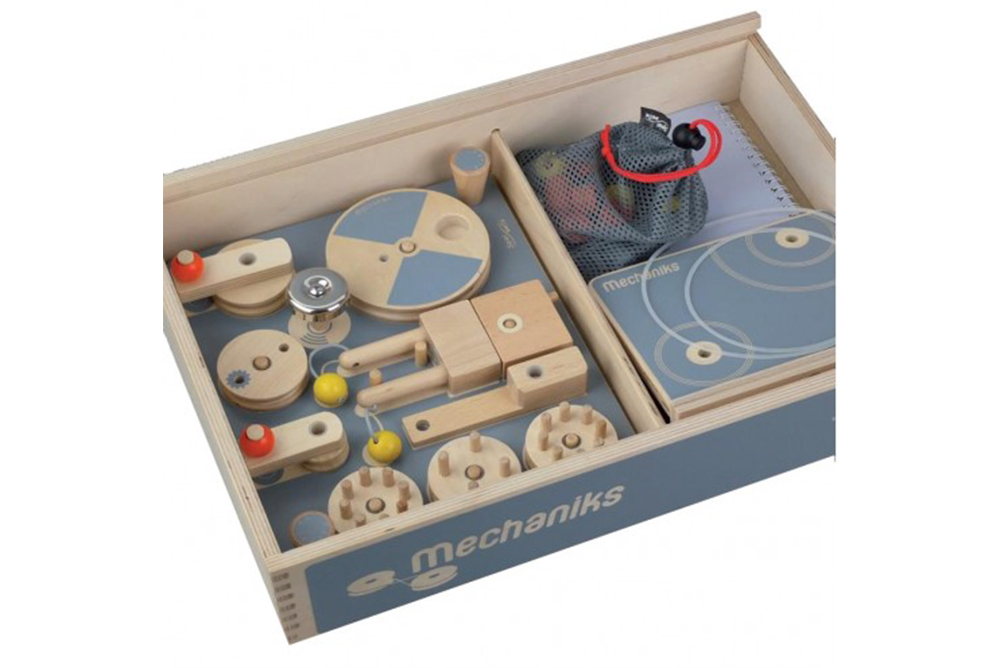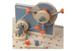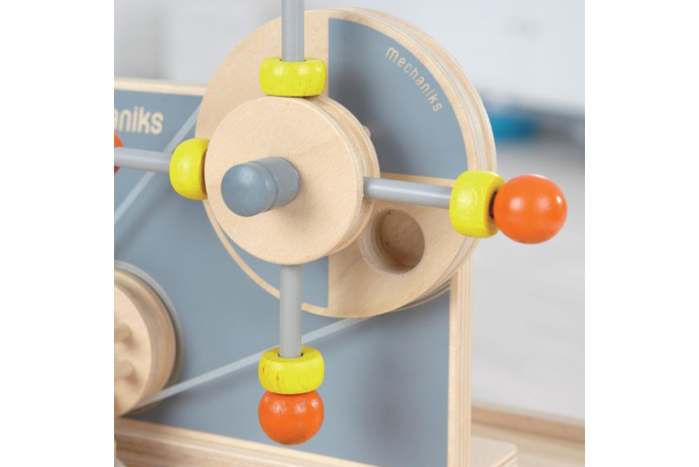 孩子們在實驗中可以插入固定棒、轉動手搖柄、傳遞旋轉運動、改變旋轉方向或者發出聲音,