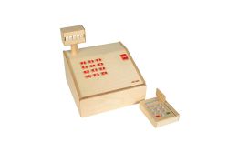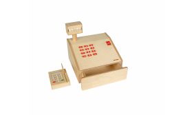 這個小小收銀機有按鍵和現金抽屜,還有一個仿真的刷卡機。
