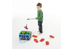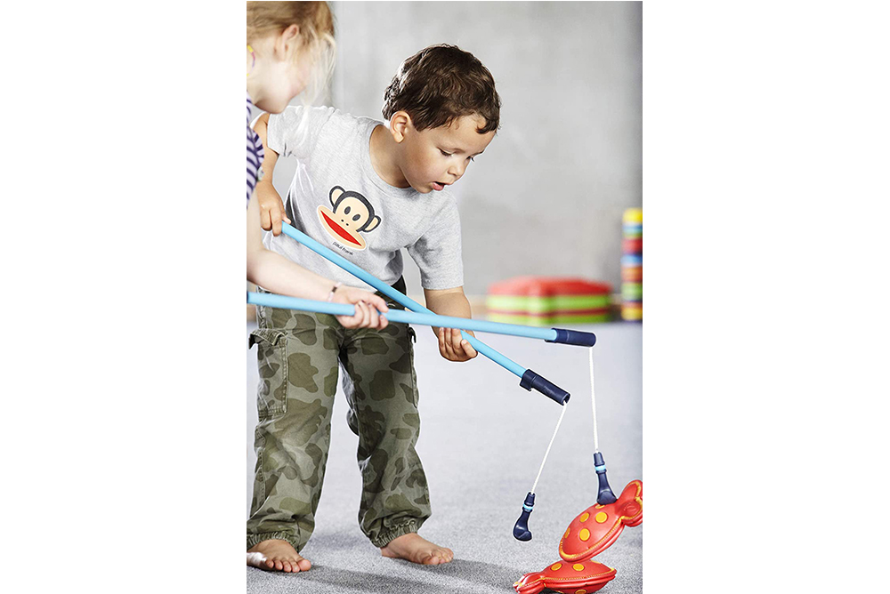 魚竿上的磁鐵可以將手掌魚上的橙色小按鈕吸住並將魚釣起。