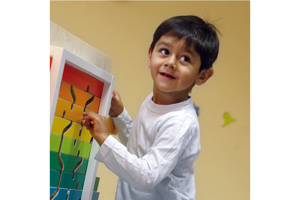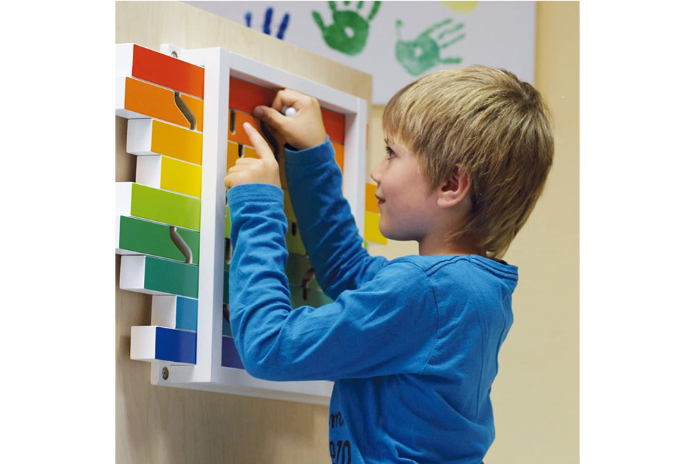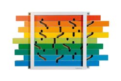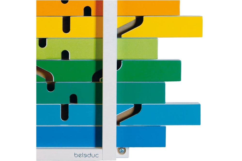 固定到牆面上的滾珠軌道有9根可以移動的木條,玻璃珠可以在這可移動的9根木條軌道中從頂部滾動到底部。