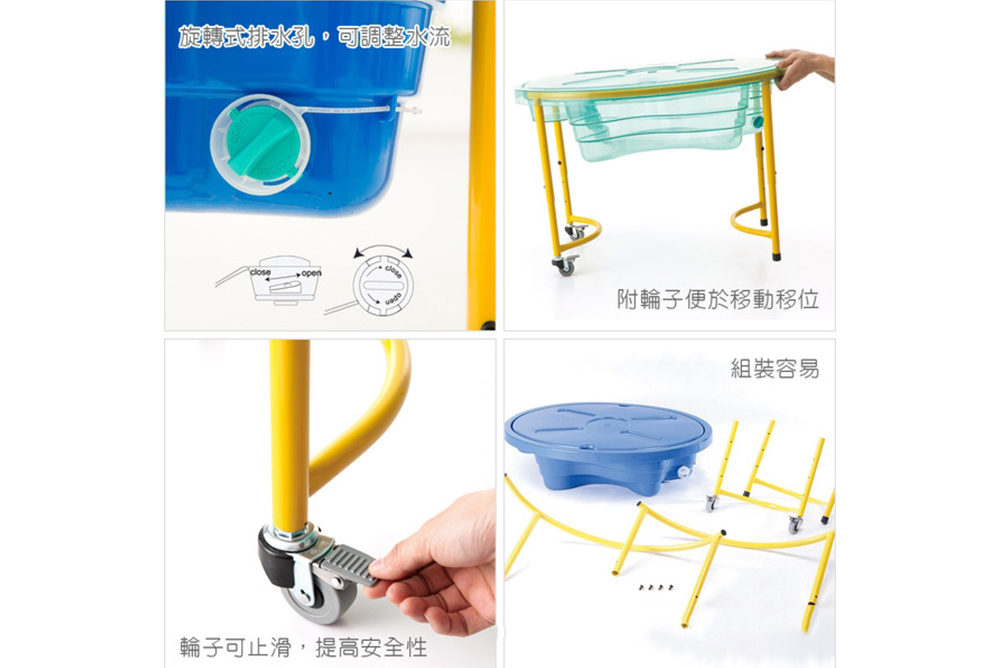 不受空間與天候限制,可輕易推到室內或戶外,滿足孩子戲水、玩沙樂趣,讓身體與大自然做最直接的接觸。