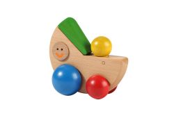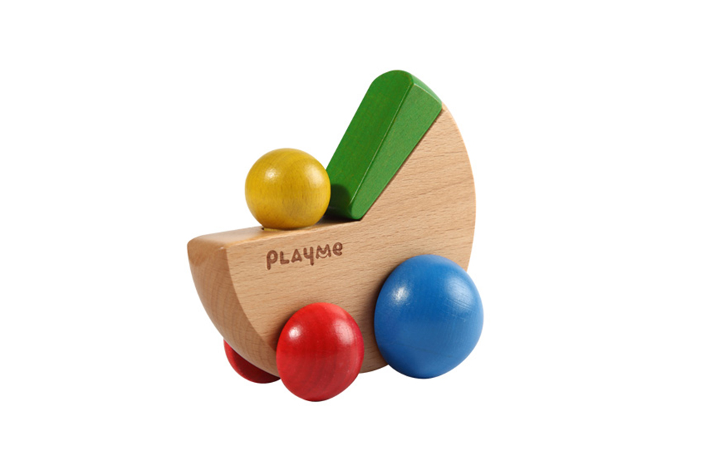 可愛的嬰兒車造型玩具以實木製作,木材表面細緻光滑、手感厚實,