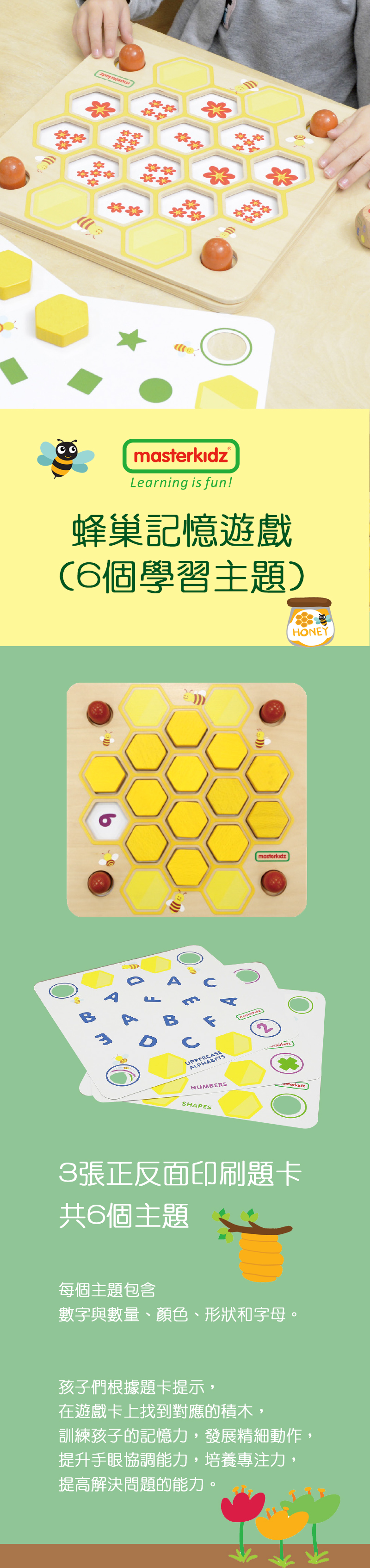 蜜蜂記憶力訓練遊戲包含有6 個學習主題,共3張正反面印刷題卡,主題包含數字與數量、顏色、形狀和字母。