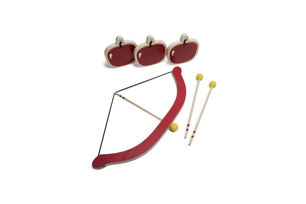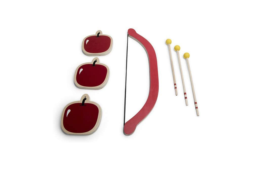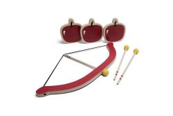 把劍放在弓上,根據難度,將蘋果放置在桌上或者用繩子吊在樹上,看看你的技能能不能射中蘋果。