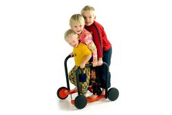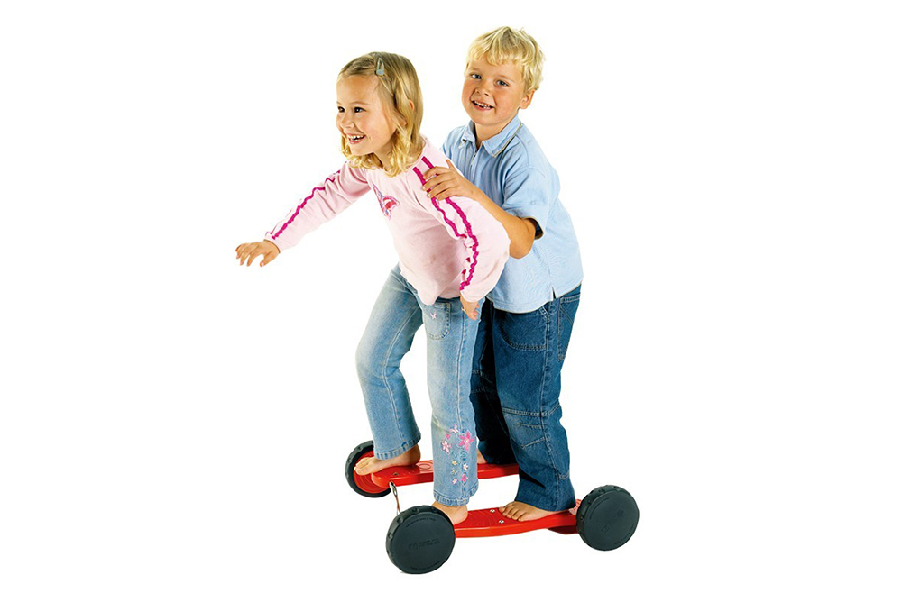 初期先用以扶手協助,雙手雙腳同時並用讓輪子前進,等孩子能保持平衡感可以拆掉扶手,只利用腳步控制滾輪前進。