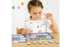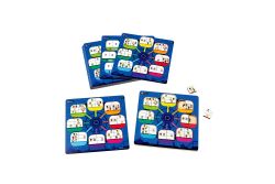 3.12張雙面題目卡,運用了人物、骰子與數字,系統化建構10以內的加減運算學習。