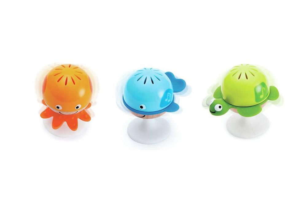 烏龜、章魚、鯨魚,三款海洋動物沙鈴能發出不同的聲音,底部的吸盤能夠吸附在任何光滑的平面上,