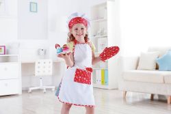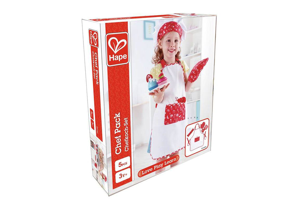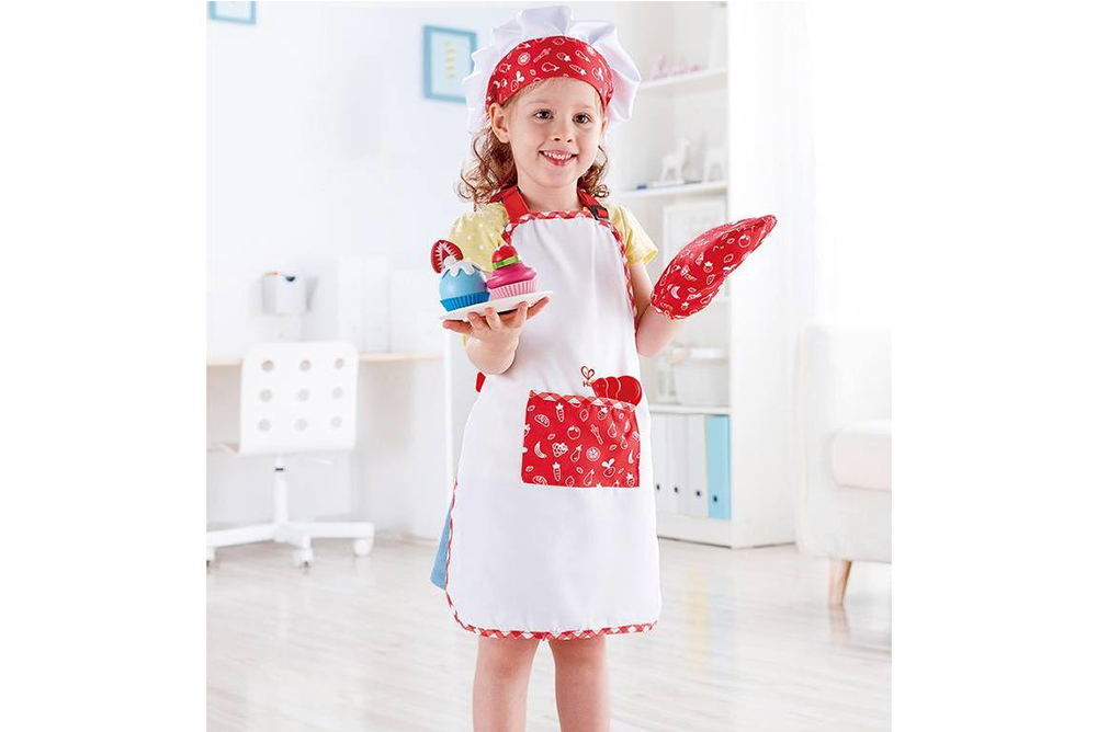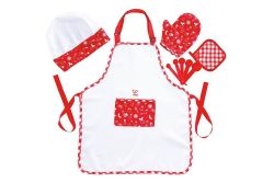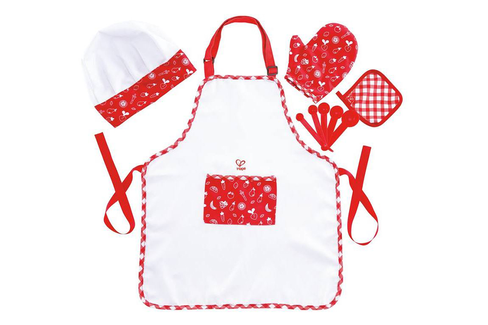 這款廚師服套組包括帽子、圍裙、手套、鍋店和五把量匙。