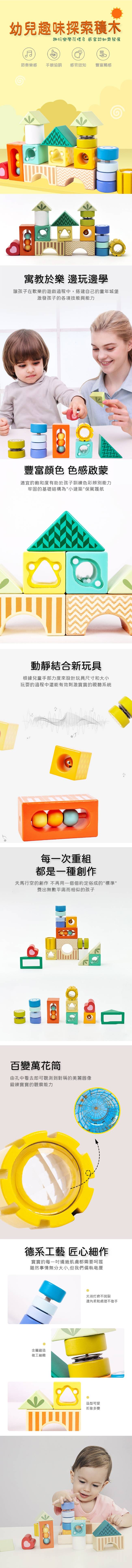 遊戲價值2.積木中加入了萬花筒、樂器、觸覺紋路等元素,放在眼睛前看一看,用手搖晃積木聽一聽,激發幼兒探索熱情。