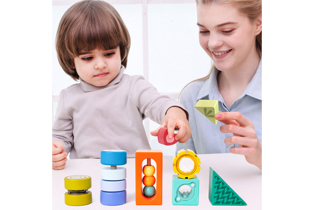 2.積木中加入了萬花筒、樂器、觸覺紋路等元素,放在眼睛前看一看,用手搖晃積木聽一聽,激發幼兒探索熱情。