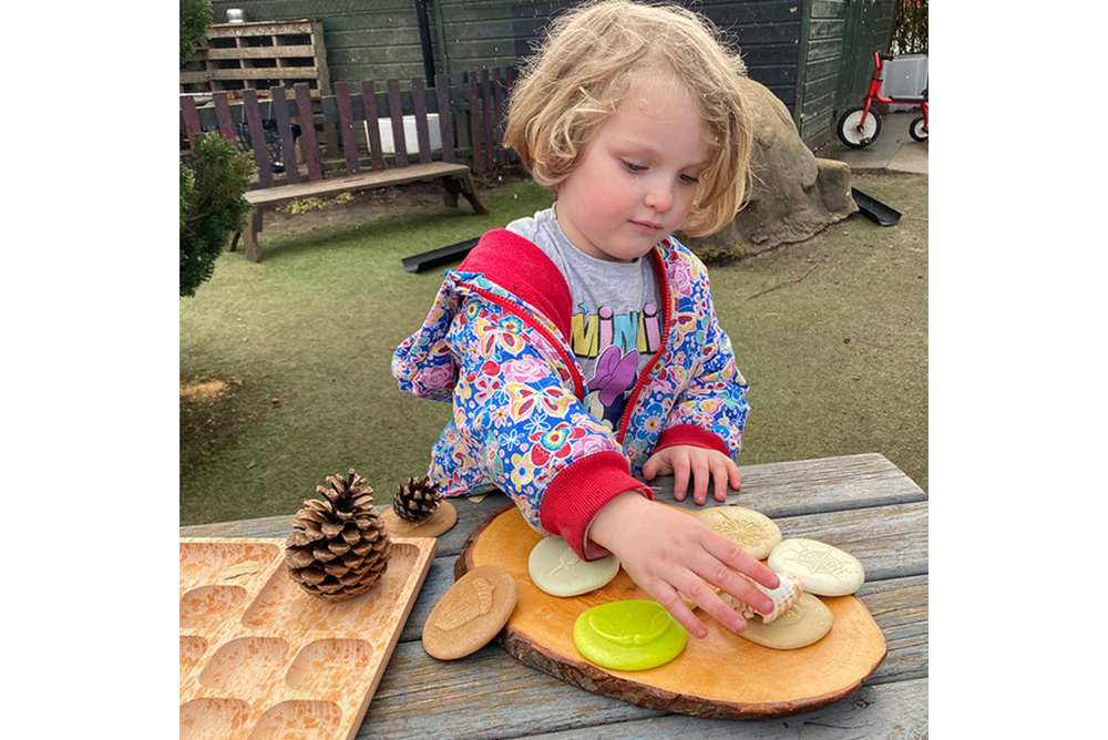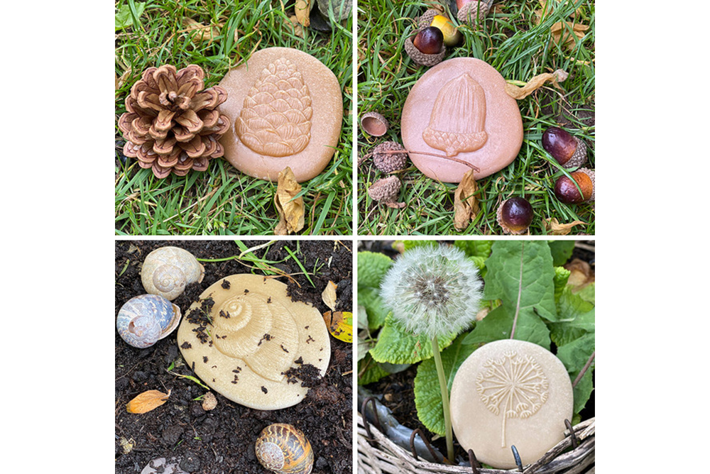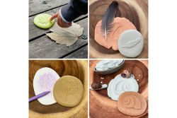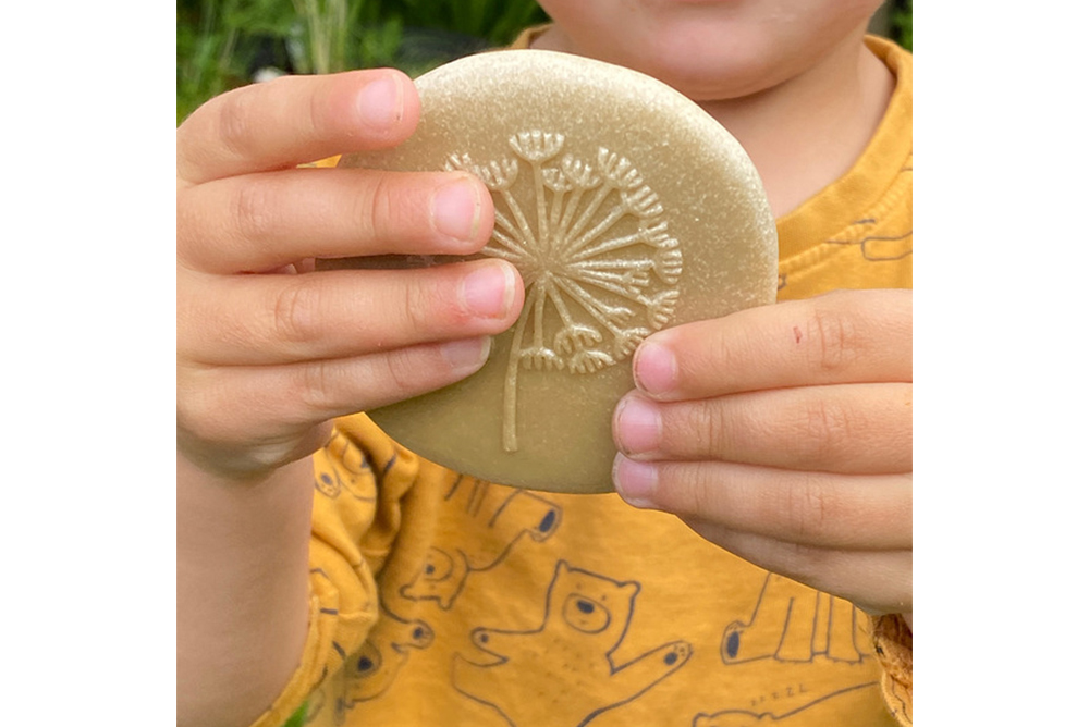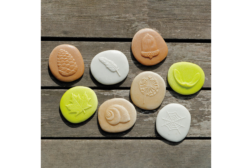 2.在黏土上蓋印章、或用蠟筆拓印畫,厚實的石頭重量讓圖案呈現更清楚。