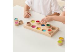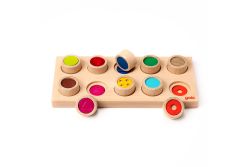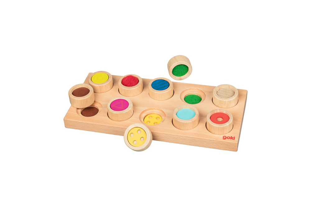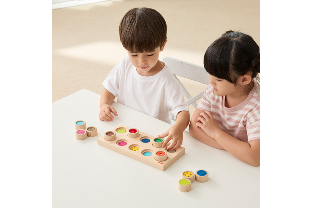 1.10種觸覺積木,使用指尖觸摸,找到與底板相同的觸覺;最後翻面即可檢查答案是否正確。