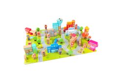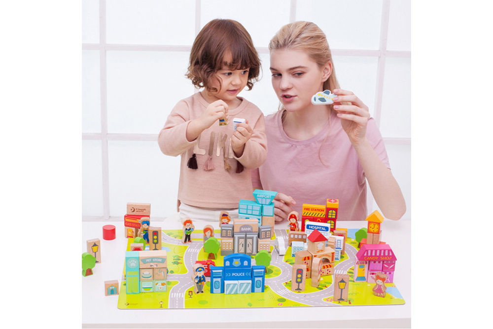 在搭建城市的過程中,逐步引導幼兒認識職業、交通規則、英文拼字及數學運算等多種相關知能。