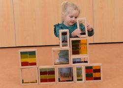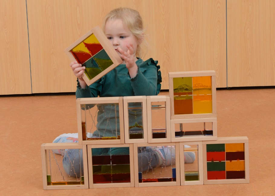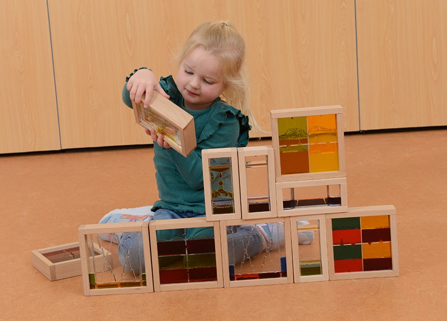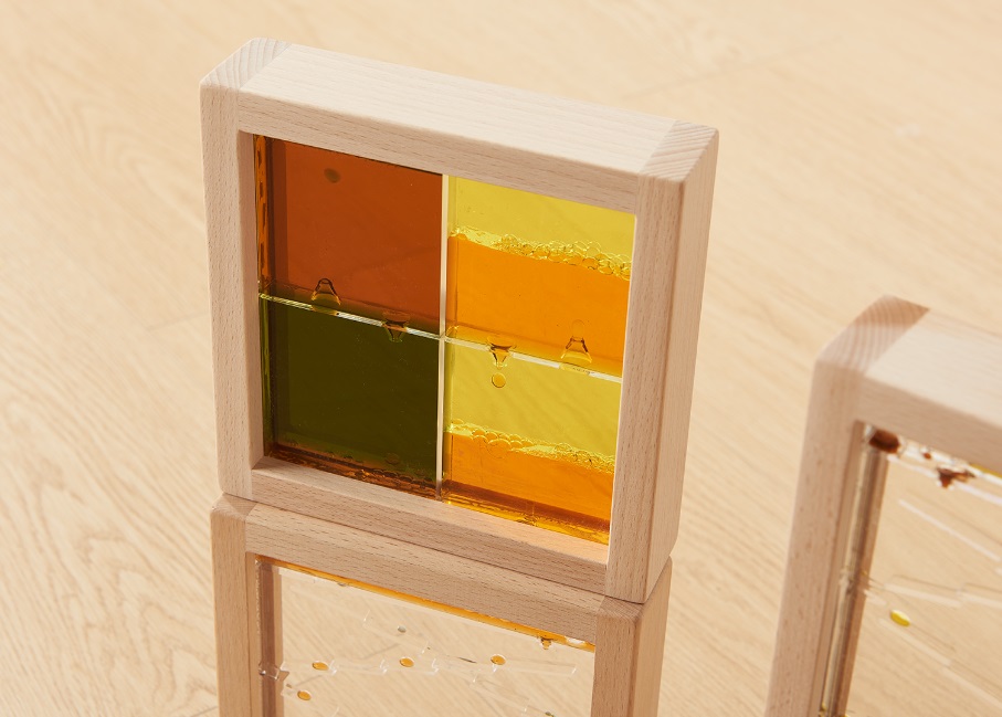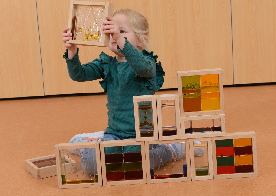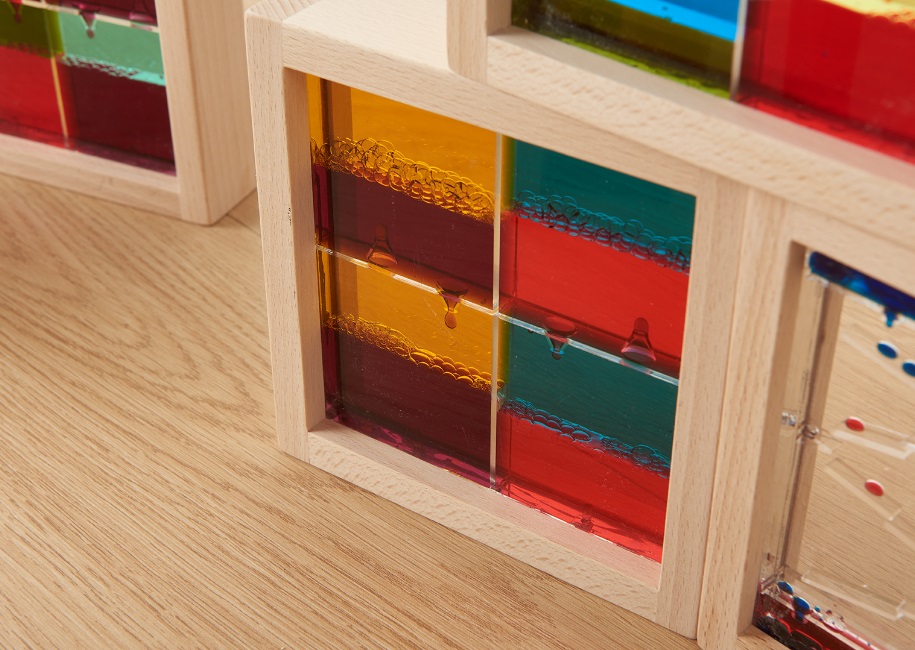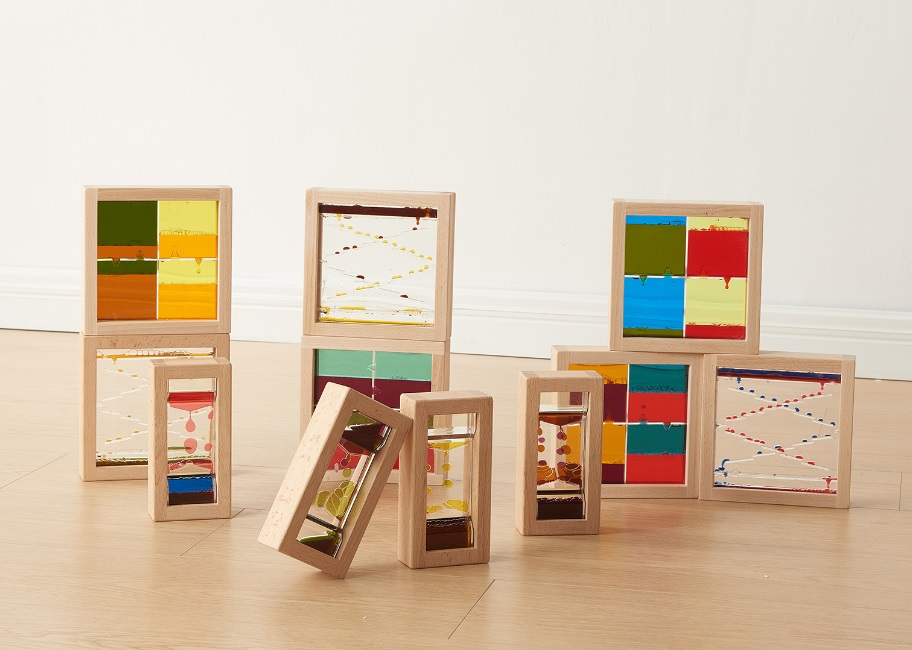 孩子們能目睹重力、運動和顏色混合的原理在他們眼前展開。無論是作為想像遊戲的背景、放在燈板上、靠近眼睛觀察,都能研究其獨特特點,或者是用堆疊方式建構積木,都能提供無盡的樂趣和創造力。