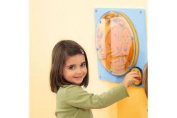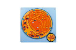 孩子利用右下角的轉輪轉動,帶動螃蟹旋轉,讓軌道內的珠子移動在迷宮中。