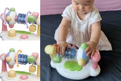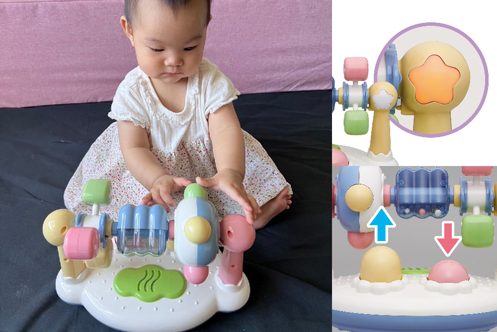 兩側的滾輪可以旋轉,當旋轉時,星形的燈光會閃爍,並且發出有趣的聲音,吸引嬰幼兒的興趣。