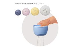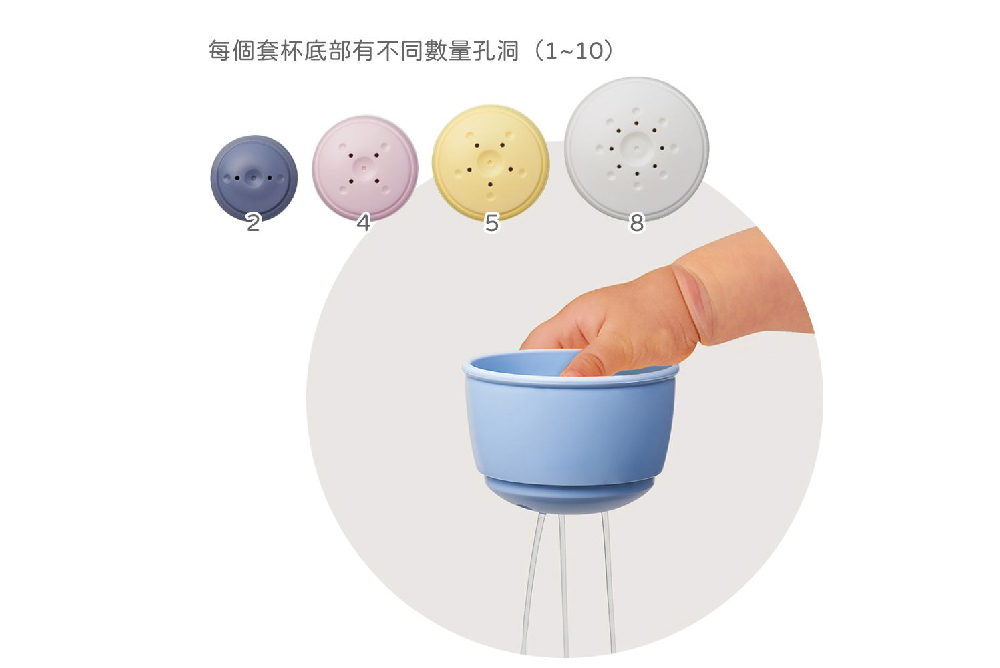 每個杯子有不同數量的孔洞,洗澡時除了舀水與流水時的樂趣外,還可以認識數字。