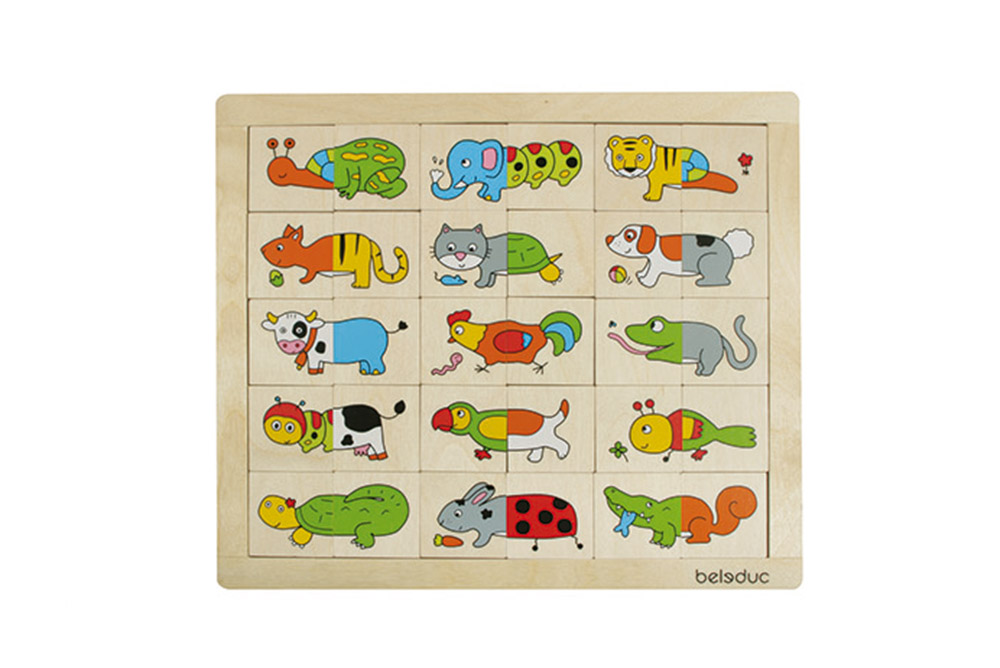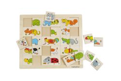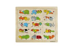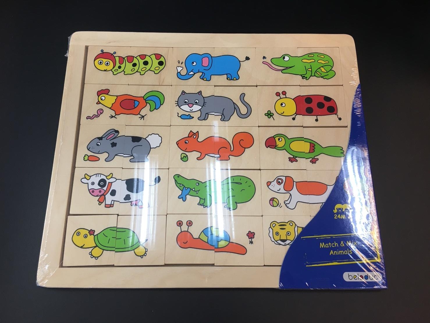 兩兩對應圖案的拼圖板,共有15組動物圖案,讓幼兒練習觀察圖案,找出線索,並認識圖案名稱。